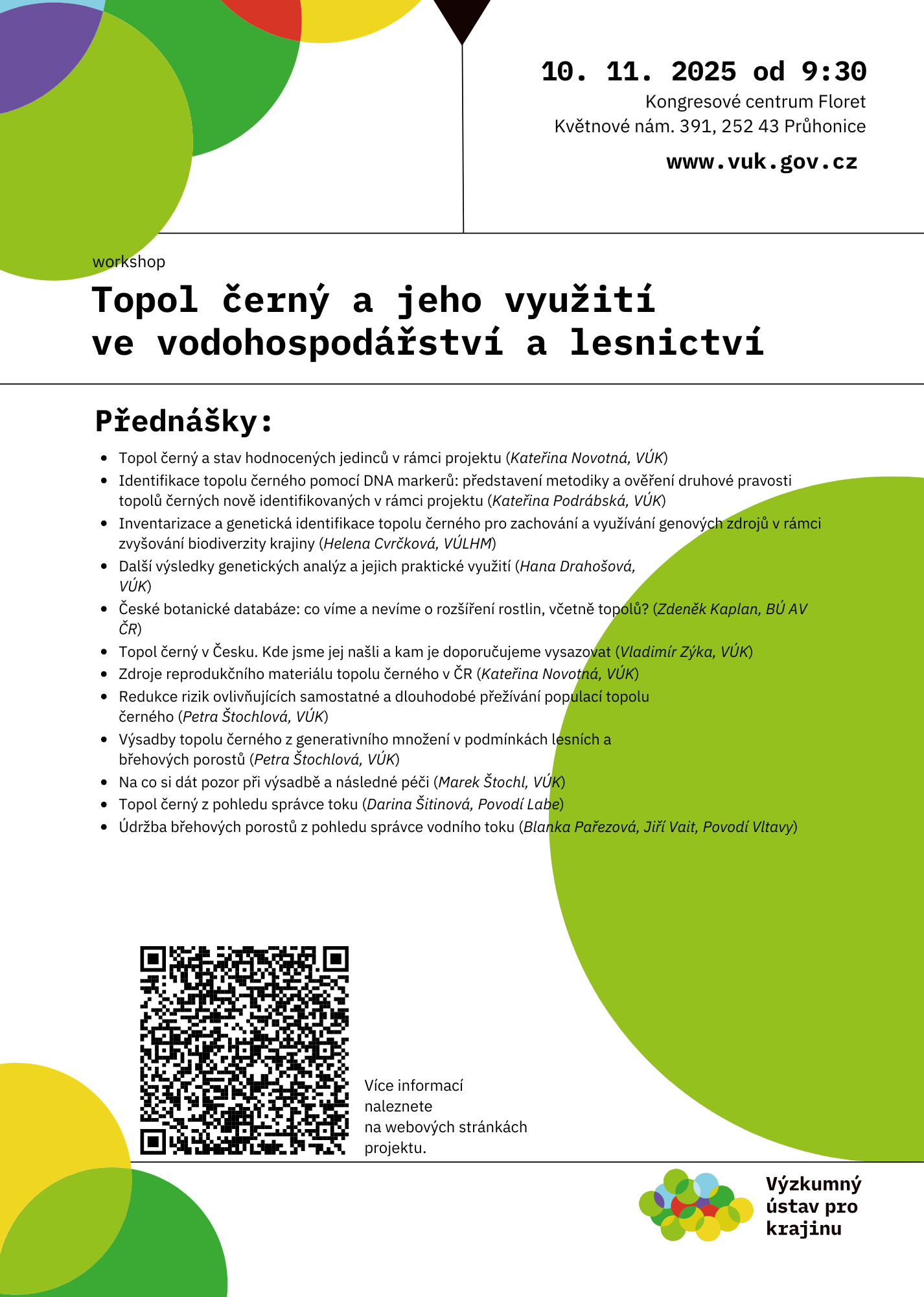 Výzkumný ústav pro krajinu ve spolupráci s partnery Lesoškolky s. r. o. a Povodí Vltavy, s. p., uskutečnil 10. listopadu 2025 ve Vzdělávacím a informačním centru Floret v Průhonicích odborný workshop na téma Topol černý a jeho využití ve vodohospodářství a lesnictví.